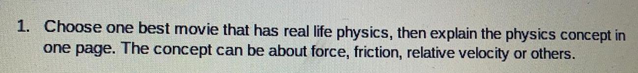 1 Choose one best movie that has real life physics then explain the physics concept in one page The concept can be about force friction relative velocity or others