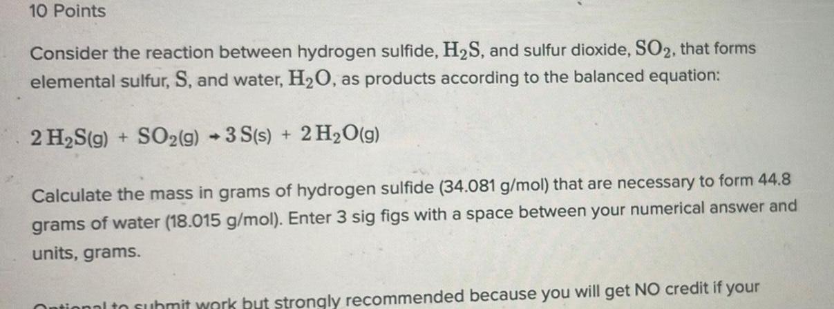 10 Points Consider the reaction between hydrogen sulfide H S and sulfur dioxide SO2 that forms elemental sulfur S and water H O as products according to the balanced equation 2 H S g SO2 g 3 S s 2 H O g Calculate the mass in grams of hydrogen sulfide 34 081 g mol that are necessary to form 44 8 grams of water 18 015 g mol Enter 3 sig figs with a space between your numerical answer and units grams Optional to submit work but strongly recommended because you will get NO credit if your