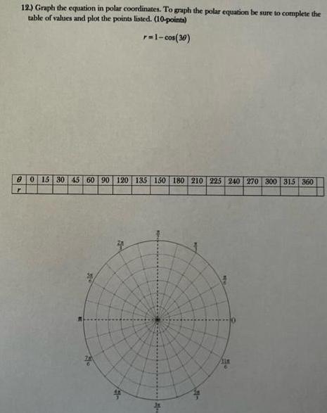 12 Graph the equation in polar coordinates To graph the polar equation be sure to complete the table of values and plot the points listed 10 points r 1 cos 30 80 15 30 45 60 90 120 135 150 180 210 225 240 270 300 315 360 r 5 A 20 118