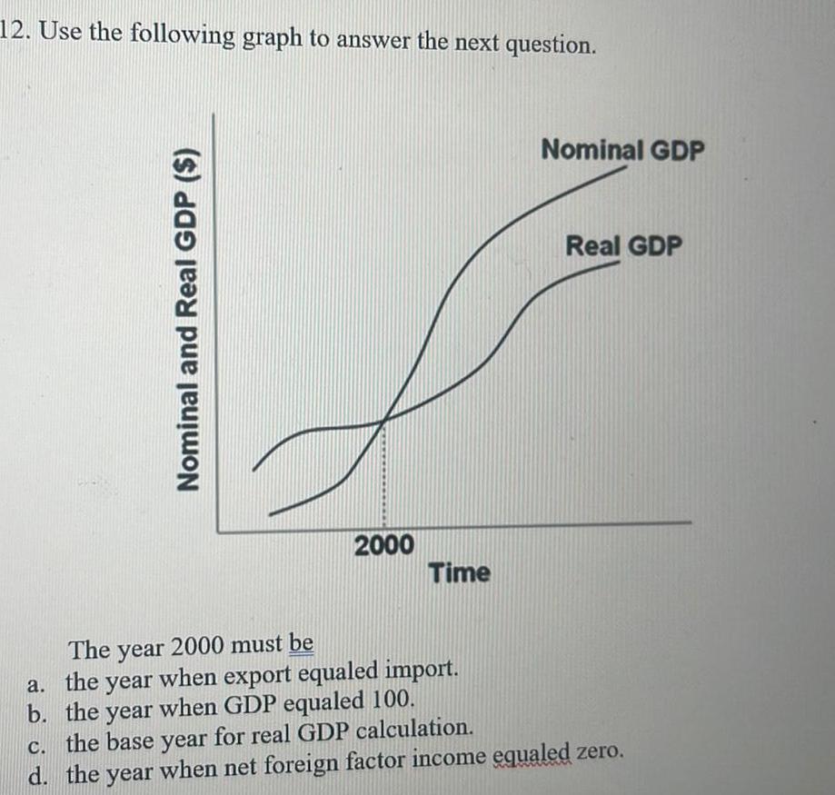 12 Use the following graph to answer the next question Nominal and Real GDP 2000 Time Nominal GDP when export equaled import Real GDP The year 2000 must be a the year b the year when GDP equaled 100 c the base year for real GDP calculation d the year when net foreign factor income equaled zero