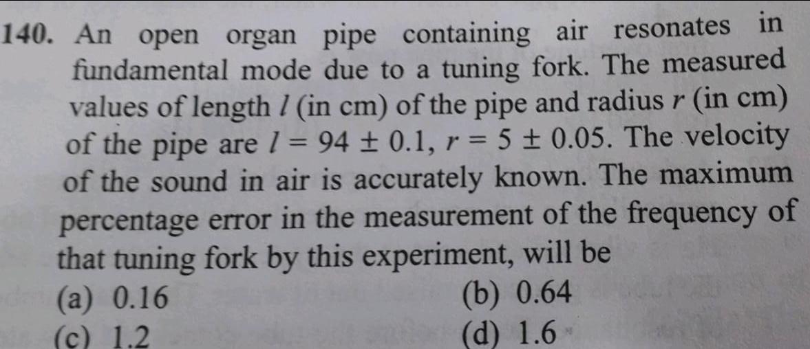 140 An open organ pipe containing air resonates in fundamental mode due to a tuning fork The measured values of length in cm of the pipe and radius r in cm of the pipe are 1 94 0 1 r 5 0 05 The velocity of the sound in air is accurately known The maximum percentage error in the measurement of the frequency of that tuning fork by this experiment will be a 0 16 b 0 64 d 1 6 c 1 2