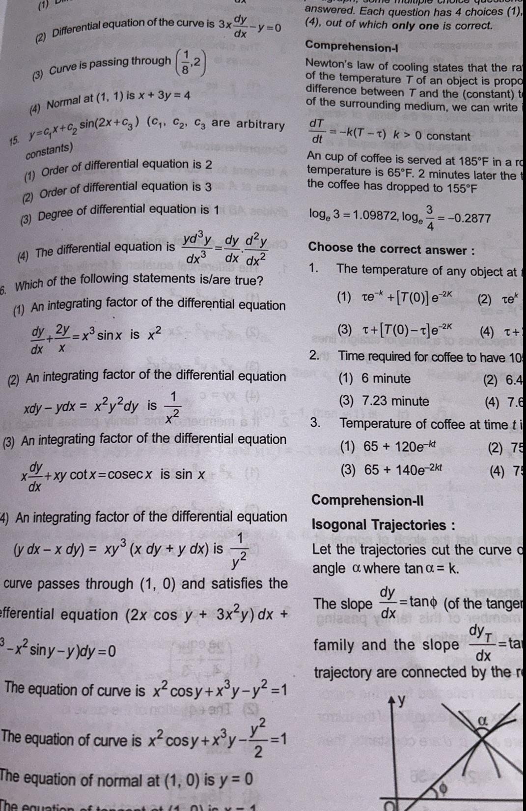 2 Differential equation of the curve is 3x dy 3 Curve is passing through 4 Normal at 1 1 is x 3y 4 15 y c x C sin 2x C3 C C C3 are arbitrary constants 1 Order of differential equation is 2 2 Order of differential equation is 3 3 Degree of differential equation is 1 A 4 The differential equation is yd y dy d y 0 3 dx dx esis 6 Which of the following statements is are true 1 An integrating factor of the differential equation dy 2y x sinx is x dx X 8 dx y 0 2 An integrating factor of the differential equation xdy ydx x y dy is 1 X 100 mm 3 An integrating factor of the differential equation dy x xy cotx cosecx is sin x dx 4 An integrating factor of the differential equation 1 y dx x dy xy x dy y dx is y curve passes through 1 0 and satisfies the efferential equation 2x cos y 3x y dx 3 x siny y dy 0 The equation of curve is The equation of curve is x cosy x y y 1 pan 3 The equation of normal The equation x cosy x y x cosy x y 12 2 at 1 0 is y 0 2 14 01 in x 1 answered Each question has 4 choices 1 4 out of which only one is correct Comprehension l Newton s law of cooling states that the ra of the temperature T of an object is propo difference between T and the constant t of the surrounding medium we can write dT dt k T t k 0 constant An cup of coffee is served at 185 F in a ro temperature is 65 F 2 minutes later the t the coffee has dropped to 155 F loge 3 1 09872 loge 0 2877 3 4 Choose the correct answer 1 The temperature of any object at 1 Tek T 0 e 2k 2 tek 2 3 3 T T 0 T e 2k 4 T Time required for coffee to have 10 1 6 minute 2 6 4 3 7 23 minute 4 7 6 CUR Temperature of coffee at time ti 1 65 120e kt 2 75 3 65 140e 2kt 4 75 Comprehension Il Isogonal Trajectories Let the trajectories cut the curve o angle a where tan k tand of the tanger dy T ta dx trajectory are connected by the r AY dy The slope onleenq dx family and the slope a