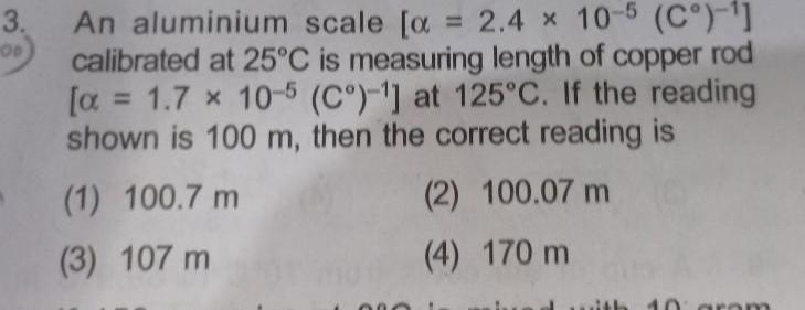 3 Of An aluminium scale 2 4 x 10 5 C calibrated at 25 C is measuring length of copper rod x 1 7 x 10 5 C 1 at 125 C If the reading shown is 100 m then the correct reading is 1 100 7 m 2 100 07 m 3 107 m 4 170 m arom