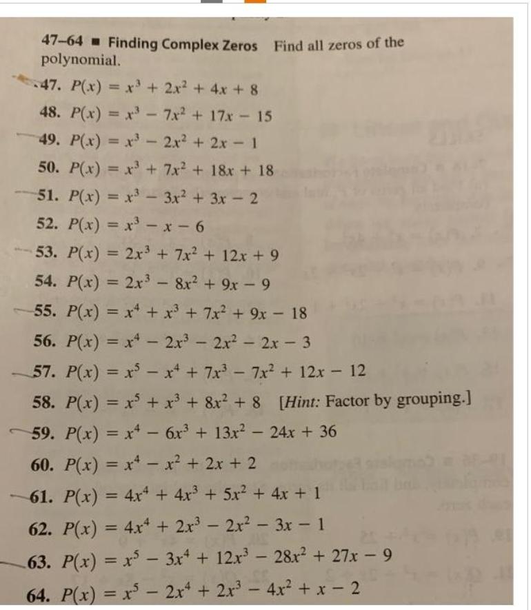 47 64 Finding Complex Zeros Find all zeros of the polynomial 47 P x x 2x 4x 8 48 P x x 7x 17x 15 2x 2x 1 49 P x x 50 P x x 7x 18x 18 51 P x x 3x 3x 2 52 P x x x 6 53 P x 2x 7x 12x 9 54 P x 2x 8x 9x 9 55 P x x x 7x 9x 18 56 P x x 2x 2x 2x 3 57 P x x x 7x 7x 12x 12 58 P x x5 x 8x 8 Hint Factor by grouping 59 P x x 6x 13x 24x 36 60 P x x x 2x 2 61 P x 4x4 4x 5x 4x 1 62 P x 4x 2x 2x 3x 1 63 P x x 3x4 12x 28x 27x 9 64 P x x 2x4 2x 4x x 2