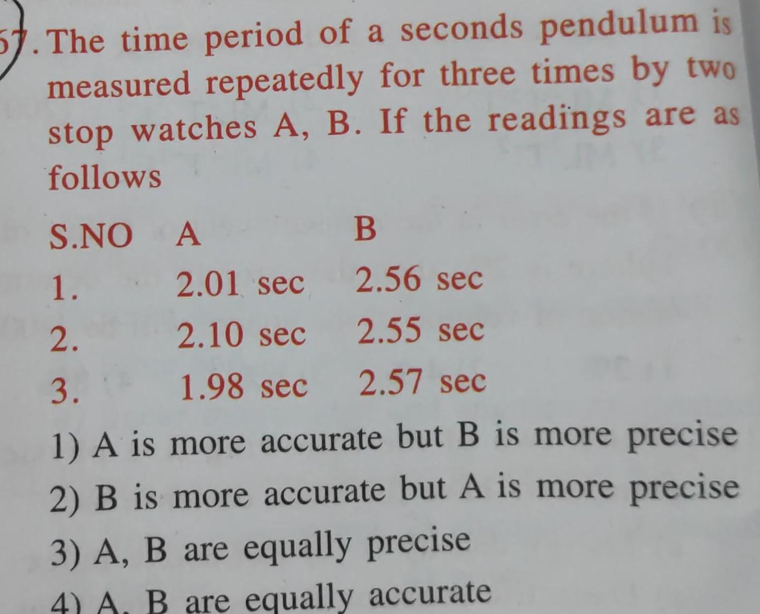 57 The time period of a seconds pendulum is measured repeatedly for three times by two stop watches A B If the readings are as follows B 1 2 01 sec 2 56 sec 2 2 10 sec 2 55 sec 3 1 98 sec 2 57 sec 1 A is more accurate but B is more precise 2 B is more accurate but A is more precise 3 A B are equally precise 4 A B are equally accurate S NO A