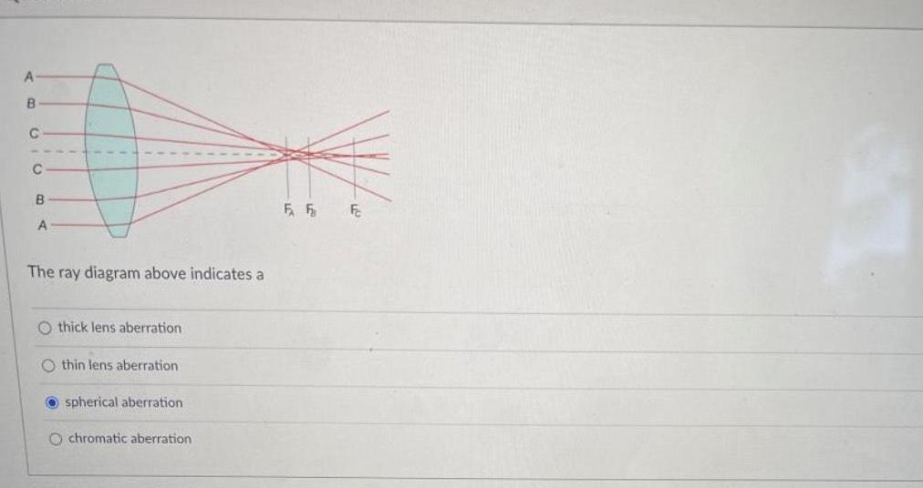 A B C C B A The ray diagram above indicates a O thick lens aberration O thin lens aberration spherical aberration O chromatic aberration F 5 F