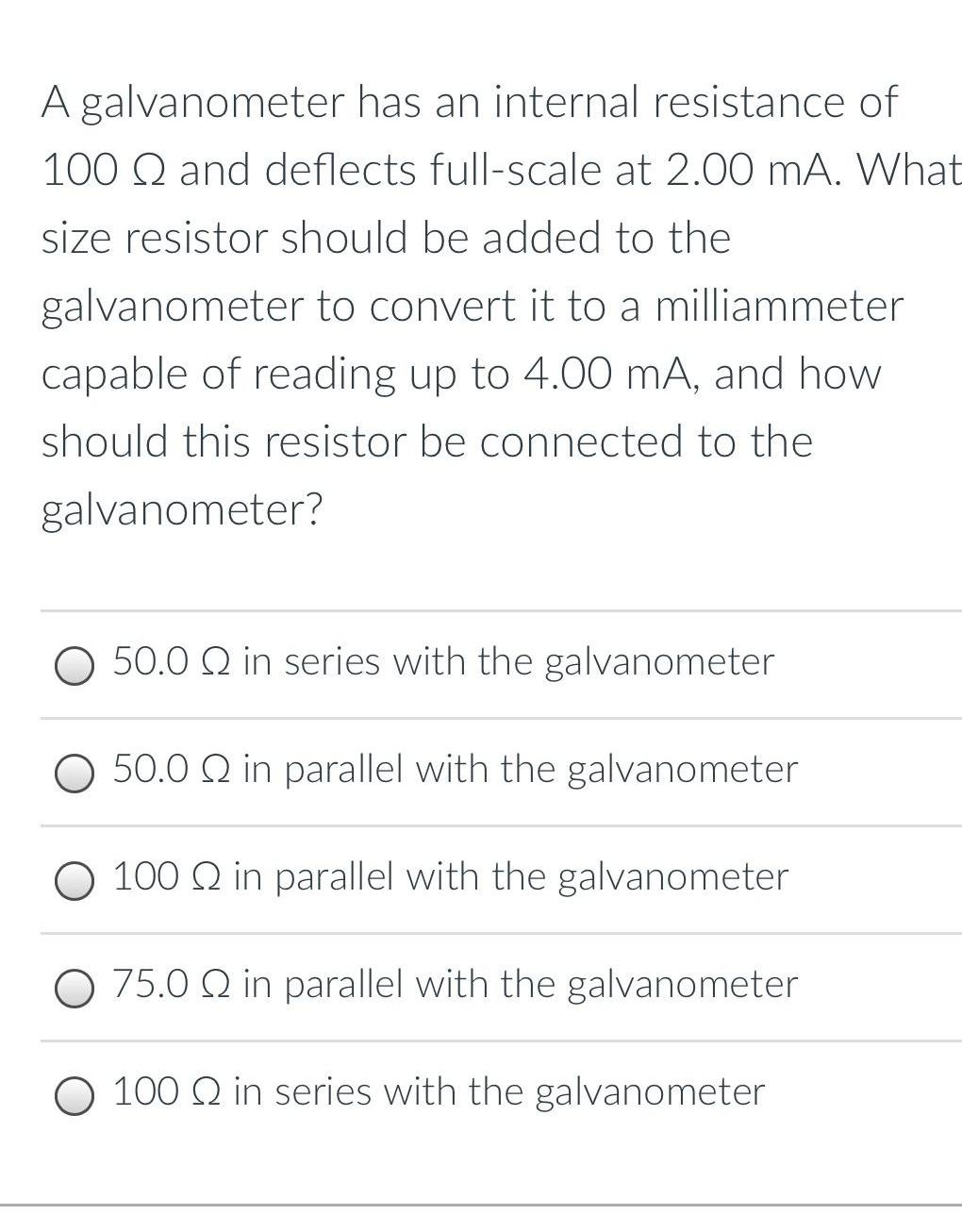 A galvanometer has an internal resistance of 100 Q and deflects full scale at 2 00 mA What size resistor should be added to the galvanometer to convert it to a milliammeter capable of reading up to 4 00 mA and how should this resistor be connected to the galvanometer 50 0 Q in series with the galvanometer 50 0 Q in parallel with the galvanometer 100 Q in parallel with the galvanometer O 75 0 Q in parallel with the galvanometer O 100 Q in series with the galvanometer