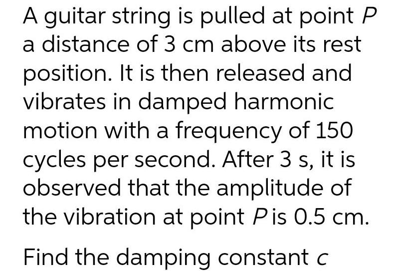 A guitar string is pulled at point P a distance of 3 cm above its rest position It is then released and vibrates in damped harmonic motion with a frequency of 150 cycles per second After 3 s it is observed that the amplitude of the vibration at point P is 0 5 cm Find the damping constant c