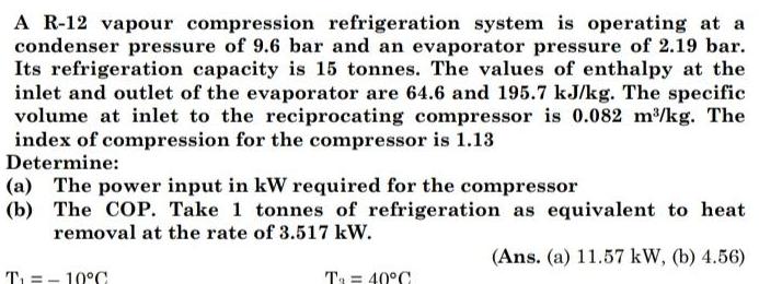 A R 12 vapour compression refrigeration system is operating at a condenser pressure of 9 6 bar and an evaporator pressure of 2 19 bar Its refrigeration capacity is 15 tonnes The values of enthalpy at the inlet and outlet of the evaporator are 64 6 and 195 7 kJ kg The specific volume at inlet to the reciprocating compressor is 0 082 m kg The index of compression for the compressor is 1 13 Determine a The power input in kW required for the compressor b The COP Take 1 tonnes of refrigeration as equivalent to heat removal at the rate of 3 517 kW Ans a 11 57 kW b 4 56 T 10 C T 40 C