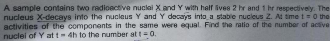 A sample contains two radioactive nuclei X and Y with half lives 2 hr and 1 hr respectively The nucleus X decays into the nucleus Y and Y decays into a stable nucleus Z At time t 0 the activities of the components in the same were equal Find the ratio of the number of active nuclei of Y at t 4h to the number at t 0
