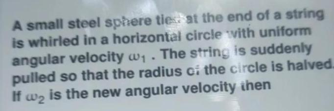 A small steel sphere tie at the end of a string is whirled in a horizontal circle with uniform angular velocity w The string is suddenly pulled so that the radius of the circle is halved If W2 is the new angular velocity then
