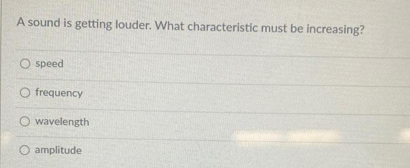 A sound is getting louder What characteristic must be increasing O speed O frequency Owavelength O amplitude