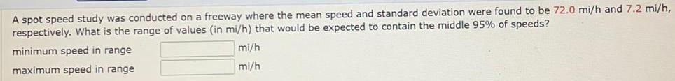 A spot speed study was conducted on a freeway where the mean speed and standard deviation were found to be 72 0 mi h and 7 2 mi h respectively What is the range of values in mi h that would be expected to contain the middle 95 of speeds minimum speed in range mi h maximum speed in range mi h