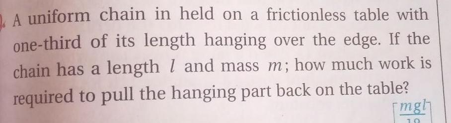 A uniform chain in held on a frictionless table with one third of its length hanging over the edge If the chain has a length 1 and mass m how much work is required to pull the hanging part back on the table mgl