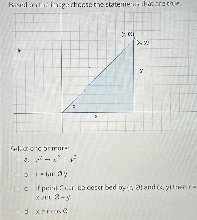 Based on the image choose the statements that are true Select one or more a r x y b 0 r tan y X r C x y y c If point C can be described by r and x y then r x and y d x rcos