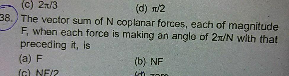 c 2 3 d 2 38 The vector sum of N coplanar forces each of magnitude F when each force is making an angle of 2 N with that preceding it is a F c NF 2 b NF zom