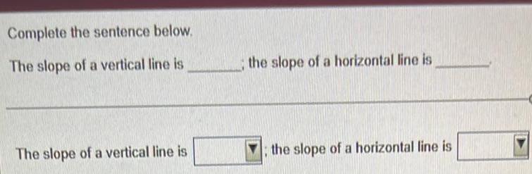 Complete the sentence below The slope of a vertical line is The slope of a vertical line is the slope of a horizontal line is the slope of a horizontal line is