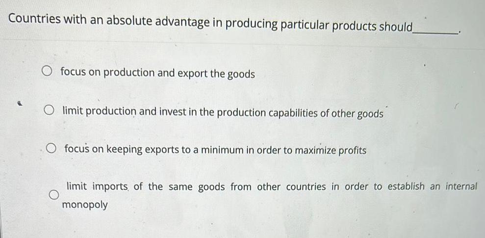 Countries with an absolute advantage in producing particular products should focus on production and export the goods limit production and invest in the production capabilities of other goods focus on keeping exports to a minimum in order to maximize profits limit imports of the same goods from other countries in order to establish an internal monopoly
