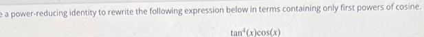 e a power reducing identity to rewrite the following expression below in terms containing only first powers of cosine tan x cos x