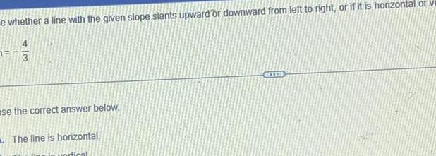 e whether a line with the given slope slants upward or downward from left to right or if it is horizontal or ve 4 73 se the correct answer below The line is horizontal rtical