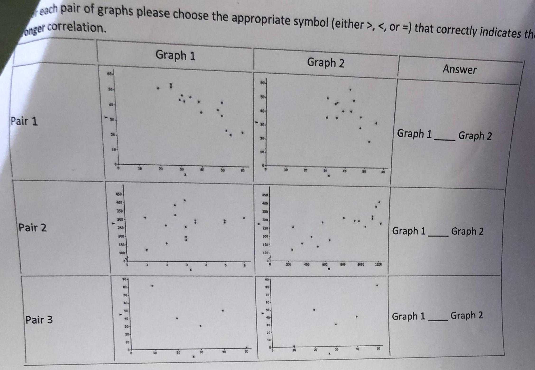 each pair of graphs please choose the appropriate symbol either or that correctly indicates the onger correlation Pair 1 Pair 2 Pair 3 58 20 10 450 400 350 300 200 150 100 A 904 70 60 50 40 30 20 10 0 Graph 1 10 to 60 50 40 30 20 10 450 400 350 300 2 50 200 150 100 A 901 80 70 60 50 40 30 20 10 0 0 5 Graph 2 8 400 600 30 2 800 1000 1200 Answer Graph 1 Graph 2 Graph 1 Graph 2 Graph 1 Graph 2