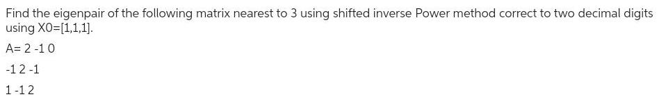 Find the eigenpair of the following matrix nearest to 3 using shifted inverse Power method correct to two decimal digits using XO 1 1 1 A 2 10 12 1 1 12