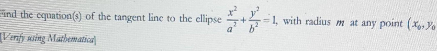 Find the equation s of the tangent line to the ellipse Verify using Mathematica 1 4 1 with radius m at any point xo Yo