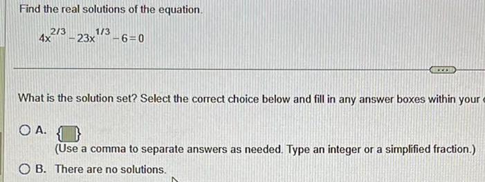 Find the real solutions of the equation 4x2 3 23x 6 0 What is the solution set Select the correct choice below and fill in any answer boxes within your e O A Use a comma to separate answers as needed Type an integer or a simplified fraction OB There are no solutions