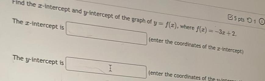 Find the z intercept and y intercept of the graph of y f z where f z 3z 2 enter the coordinates of the z intercept The z intercept is The y intercept is I enter the coordinates of the intor 5 pts 10