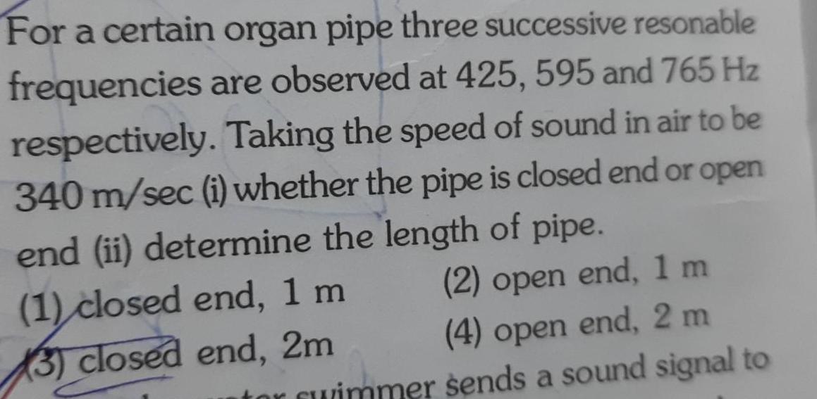 For a certain organ pipe three successive resonable frequencies are observed at 425 595 and 765 Hz respectively Taking the speed of sound in air to be 340 m sec i whether the pipe is closed end or open end ii determine the length of pipe 2 open end 1 m 4 open end 2 m tor cuimmer sends a sound signal to 1 closed end 1 m 3 closed end 2m