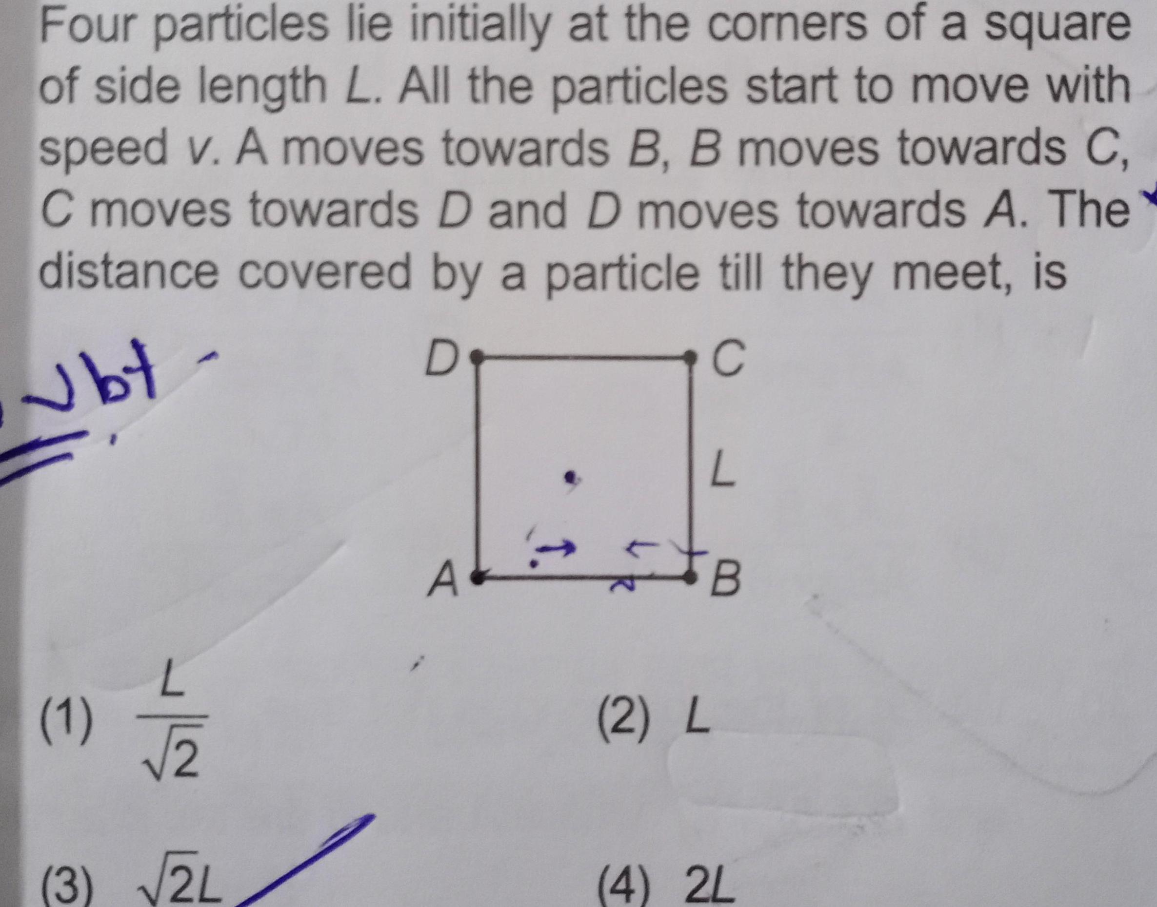 Four particles lie initially at the corners of a square of side length L All the particles start to move with speed v A moves towards B B moves towards C C moves towards D and D moves towards A The distance covered by a particle till they meet is Uby D C 1 3 2L A 1 L B 2 L 4 2L