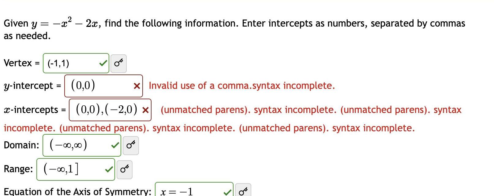 Given y as needed x 2x find the following information Enter intercepts as numbers separated by commas Vertex 1 1 y intercept x Invalid use of a comma syntax incomplete x intercepts 0 0 2 0 unmatched parens syntax incomplete unmatched parens syntax incomplete unmatched parens syntax incomplete unmatched parens syntax incomplete Domain 00 00 Range 0 1 Equation of the Axis of Symmetry x 1 0 0