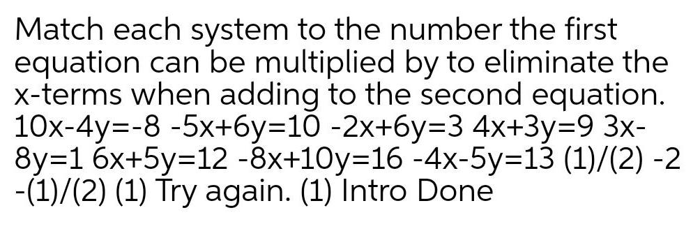 Match each system to the number the first equation can be multiplied by to eliminate the x terms when adding to the second equation 10x 4y 8 5x 6y 10 2x 6y 3 4x 3y 9 3x 8y 1 6x 5y 12 8x 10y 16 4x 5y 13 1 2 2 1 2 1 Try again 1 Intro Done
