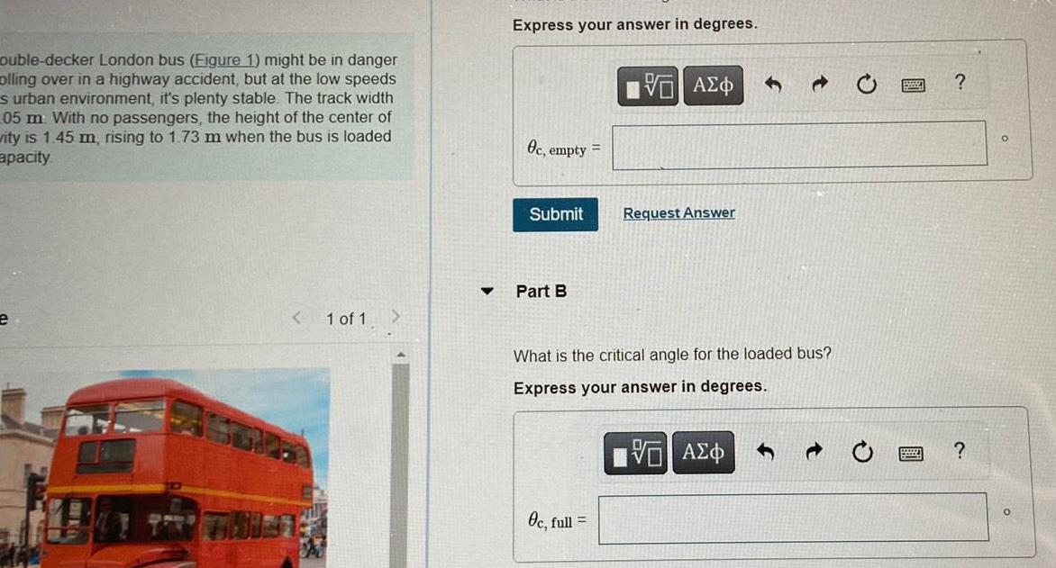 ouble decker London bus Figure 1 might be in danger olling over in a highway accident but at the low speeds s urban environment it s plenty stable The track width 05 m With no passengers the height of the center of vity is 1 45 m rising to 1 73 m when the bus is loaded apacity e NI 1 of 1 Express your answer in degrees Oc empty Submit Part B VAEO Oc full Request Answer What is the critical angle for the loaded bus Express your answer in degrees V A O O wwww