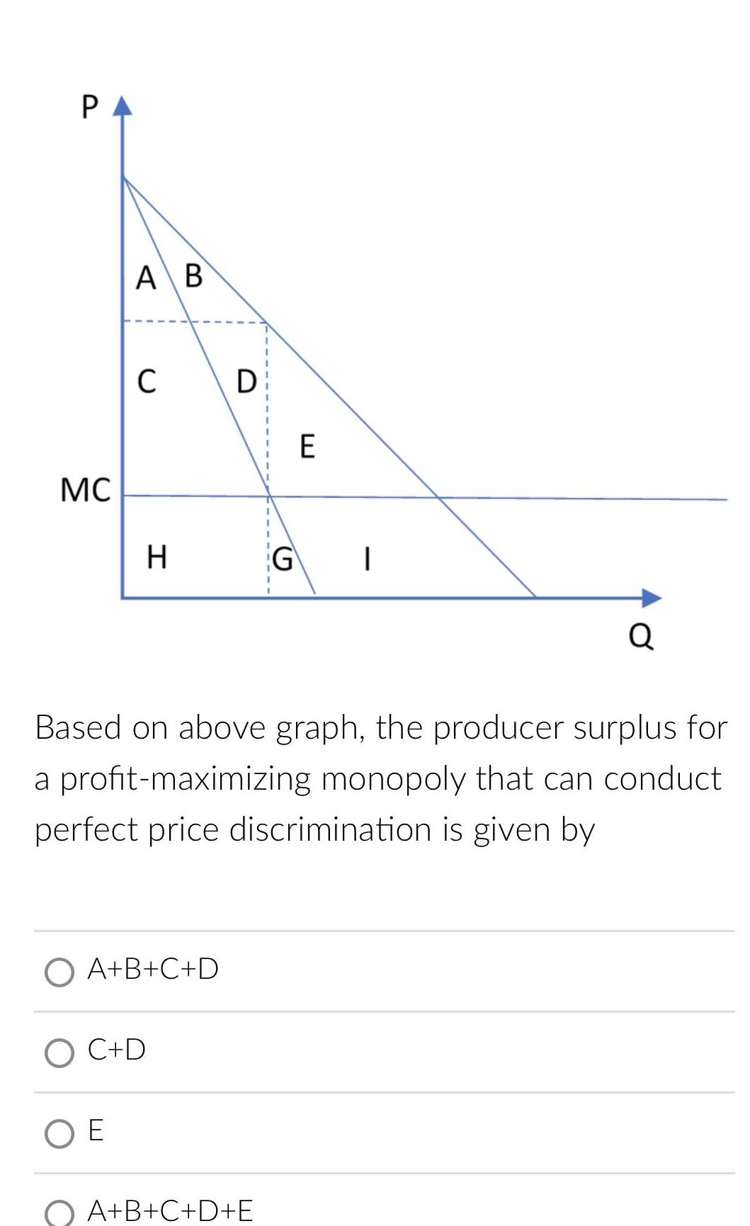 PA MC A B C OE H A B C D C D D Based on above graph the producer surplus for a profit maximizing monopoly that can conduct perfect price discrimination is given by E A B C D E G I Q