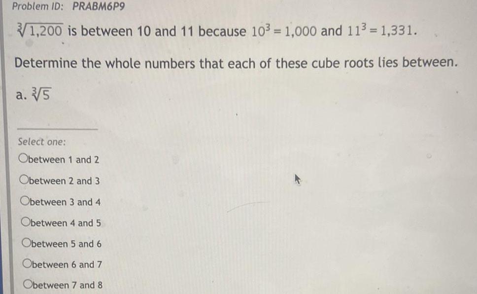 Problem ID PRABM6P9 1 200 is between 10 and 11 because 103 1 000 and 11 1 331 Determine the whole numbers that each of these cube roots lies between a 5 Select one Obetween 1 and 2 Obetween 2 and 3 Obetween 3 and 4 Obetween 4 and 5 Obetween 5 and 6 Obetween 6 and 7 Obetween 7 and 8