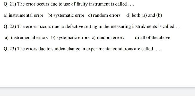 Q 21 The error occurs due to use of faulty instrument is called a instrumental error b systematic error c random errors d both a and b Q 22 The errors occurs due to defective setting in the measuring instrukments is called a instrumental errors b systematic errors c random errors d all of the above Q 23 The errors due to sudden change in experimental conditions are called