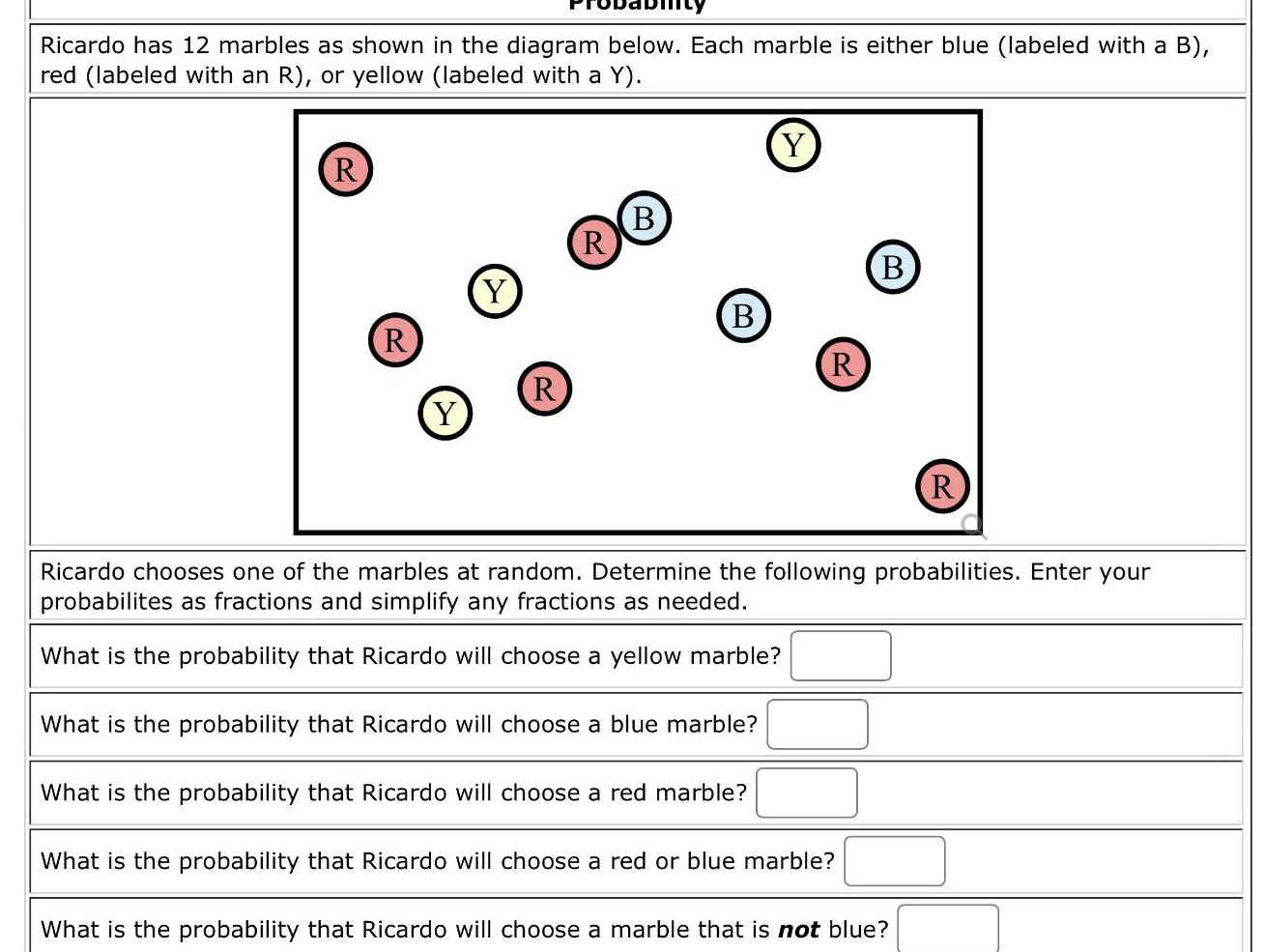 Ricardo has 12 marbles as shown in the diagram below Each marble is either blue labeled with a B red labeled with an R or yellow labeled with a Y R R Y Y R R B B What is the probability that Ricardo will choose a blue marble Y What is the probability that Ricardo will choose a red marble R Ricardo chooses one of the marbles at random Determine the following probabilities Enter your probabilites as fractions and simplify any fractions as needed What is the probability that Ricardo will choose a yellow marble B What is the probability that Ricardo will choose a red or blue marble R What is the probability that Ricardo will choose a marble that is not blue