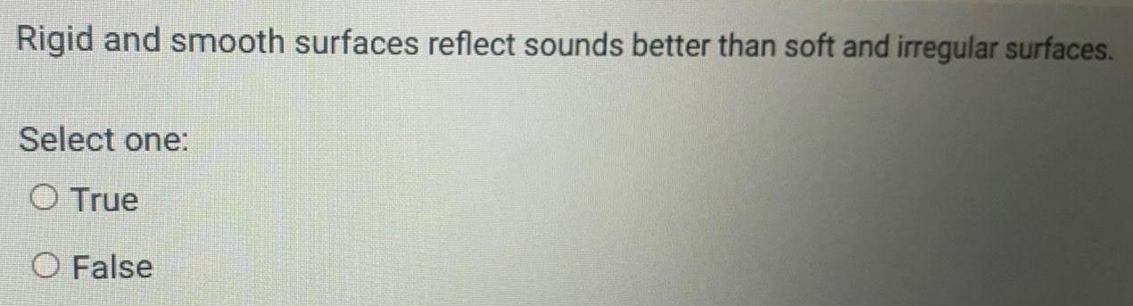 Rigid and smooth surfaces reflect sounds better than soft and irregular surfaces Select one O True O False