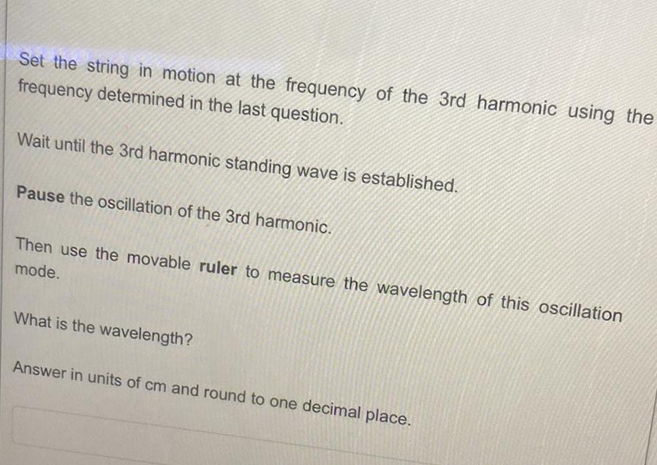 Set the string in motion at the frequency of the 3rd harmonic using the frequency determined in the last question Wait until the 3rd harmonic standing wave is established Pause the oscillation of the 3rd harmonic Then use the movable ruler to measure the wavelength of this oscillation mode What is the wavelength Answer in units of cm and round to one decimal place