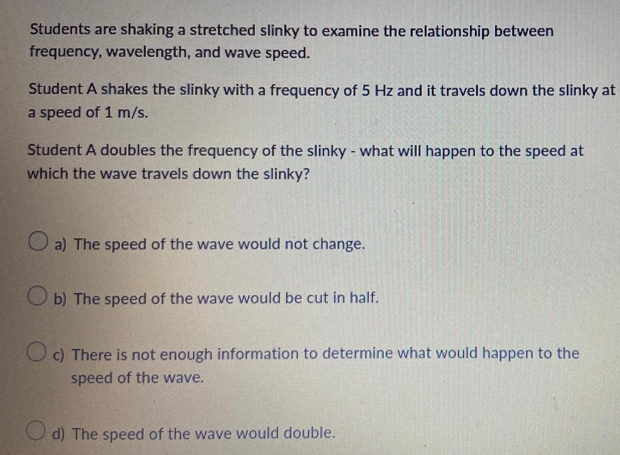 Students are shaking a stretched slinky to examine the relationship between frequency wavelength and wave speed Student A shakes the slinky with a frequency of 5 Hz and it travels down the slinky at a speed of 1 m s Student A doubles the frequency of the slinky what will happen to the speed at which the wave travels down the slinky a The speed of the wave would not change b The speed of the wave would be cut in half Oc There is not enough information to determine what would happen to the speed of the wave d The speed of the wave would double
