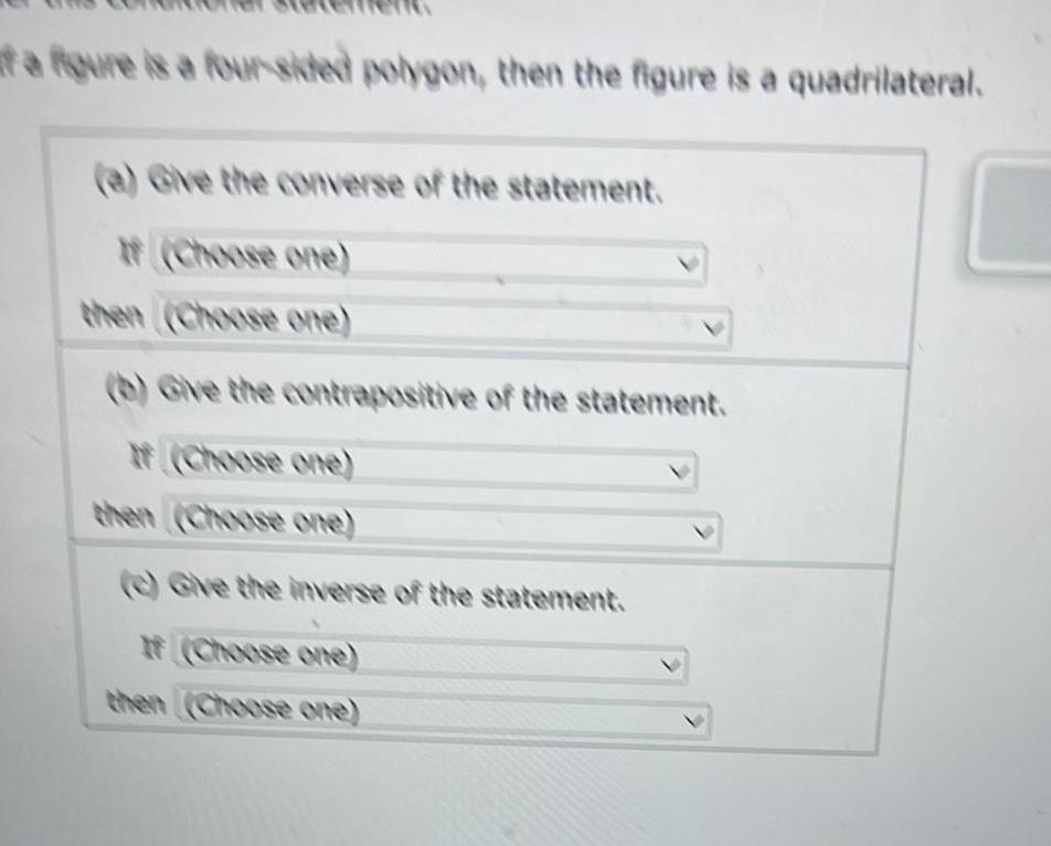 ta Roure is a four sided polygon then the figure is a quadrilateral a Give the converse of the statement Choose one then Choose one b Give the contrapositive of the statement Choose one then Choose one e Give the inverse of the statement If Choose one then Choose one