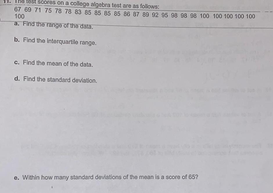 test scores on a college algebra test are as follows 67 69 71 75 78 78 83 85 85 85 85 86 87 89 92 95 98 98 98 100 100 100 100 100 100 a Find the range of the data b Find the interquartile range c Find the mean of the data d Find the standard deviation e Within how many standard deviations of the mean is a score of 65