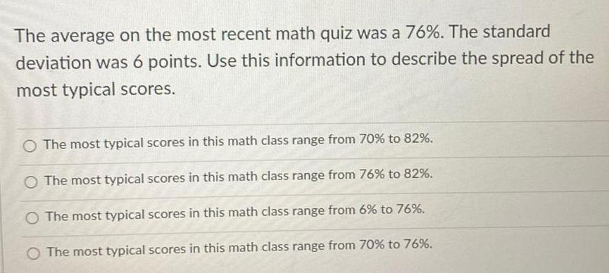 The average on the most recent math quiz was a 76 The standard deviation was 6 points Use this information to describe the spread of the most typical scores O The most typical scores in this math class range from 70 to 82 O The most typical scores in this math class range from 76 to 82 O The most typical scores in this math class range from 6 to 76 O The most typical scores in this math class range from 70 to 76