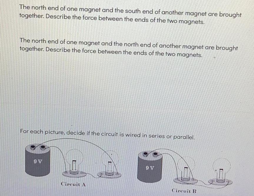 The north end of one magnet and the south end of another magnet are brought together Describe the force between the ends of the two magnets The north end of one magnet and the north end of another magnet are brought together Describe the force between the ends of the two magnets For each picture decide if the circuit is wired in series or parallel 9 V Circuit A 9 V Circuit B