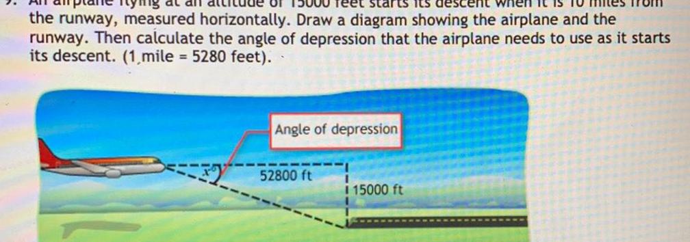 the runway measured horizontally Draw a diagram showing the airplane and the runway Then calculate the angle of depression that the airplane needs to use as it starts its descent 1 mile 5280 feet Angle of depression 52800 ft 1 I 15000 ft