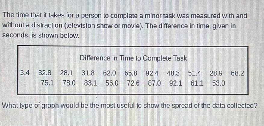 The time that it takes for a person to complete a minor task was measured with and without a distraction television show or movie The difference in time given in seconds is shown below Difference in Time to Complete Task 3 4 32 8 28 1 31 8 62 0 65 8 92 4 48 3 51 4 28 9 68 2 75 1 78 0 83 1 56 0 72 6 87 0 92 1 61 1 53 0 What type of graph would be the most useful to show the spread of the data collected