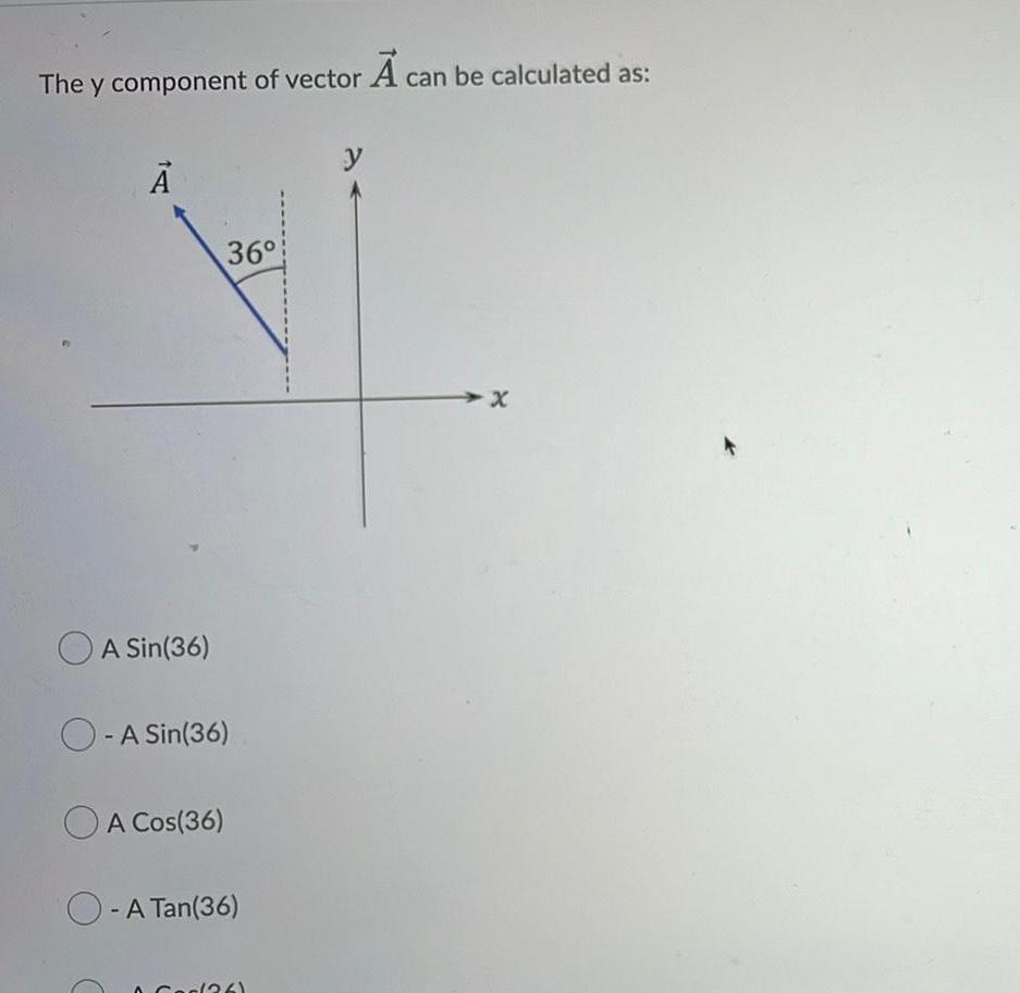 The y component of vector A can be calculated as A Sin 36 36 O A Sin 36 A Cos 36 O A Tan 36 261 y