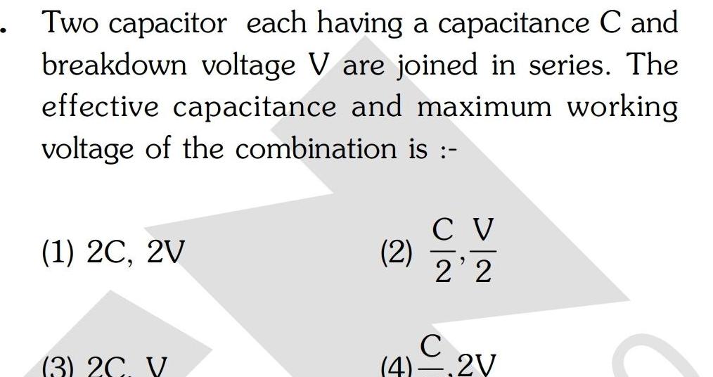 Two capacitor each having a capacitance C and breakdown voltage V are joined in series The effective capacitance and maximum working voltage of the combination is 1 2C 2V 3 2C V 2 C V 2 2 4 2V