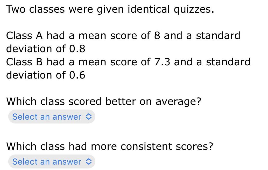 Two classes were given identical quizzes Class A had a mean score of 8 and a standard deviation of 0 8 Class B had a mean score of 7 3 and a standard deviation of 0 6 Which class scored better on average Select an answer Which class had more consistent scores Select an answer